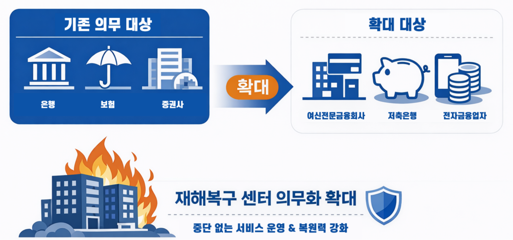 기존에는 은행, 보험, 금융투자업자 등 주요 금융사들에게만 재해복구 센터 설치가 의무화되어 있었습니다. 하지만 이번 개정으로 인해 2026년 2월 5일부터는 다음과 같은 기관들도 의무적으로 재해복구 센터를 구축해야 합니다.