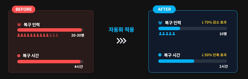 이 두 요소가 결합되면 복구 시간은 기존 대비 50% 단축, 필요 인력은 70% 감소하는 효과가 있습니다.