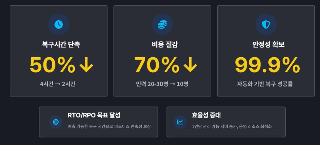 결국 자동화는 단순히 시간을 줄이는 수준을 넘어서, 복구 품질을 표준화하고, 사람의 개입을 최소화해 장애 상황에서도 안정적으로 동일한 결과를 보장하는 구조입니다.