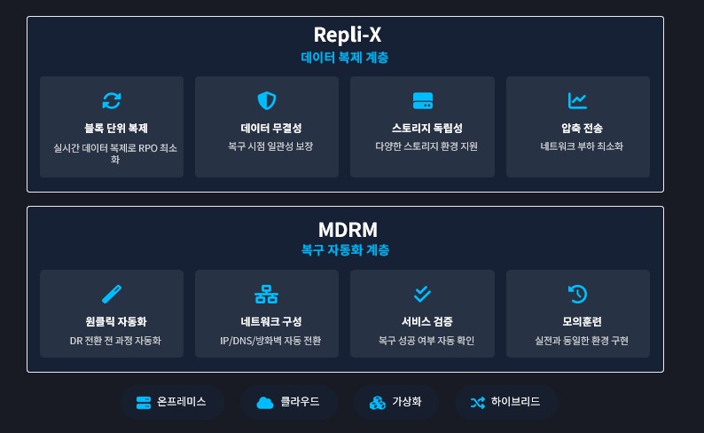 Repli-X는 실시간 블록 복제로 데이터 정합성을 유지하고, MDRM은 워크플로우 기반 자동 오케스트레이션으로 복잡한 복구 절차를 자동화합니다.