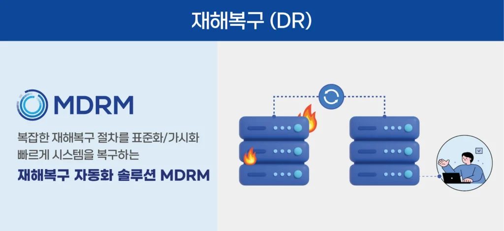 가장 큰 문제는 수작업 복구로 인해 복구시간목표(RTO)가 증가한다는 점입니다. 재해 발생 시 복구 절차가 복잡하고 수많은 단계를 거쳐야 하는데, 이를 수작업으로 처리할 경우 복구 시간이 늘어날 뿐만 아니라, 휴먼 에러의 위험성이 매우 높아집니다. IT 자동화 솔루션 MDRM은 다음과 같은 이점을 제공하여 이 문제를 해결합니다.